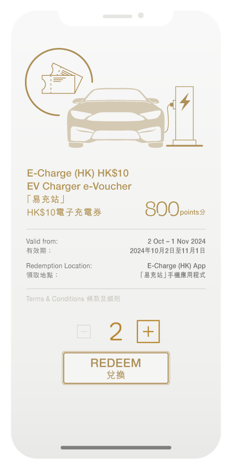 For above members2, we are also introducing a more flexible payment method – redeem one E-Charge (HK) HK$10 EV Charger e-Voucher3 for just 800 above points to complete your payment more easily!