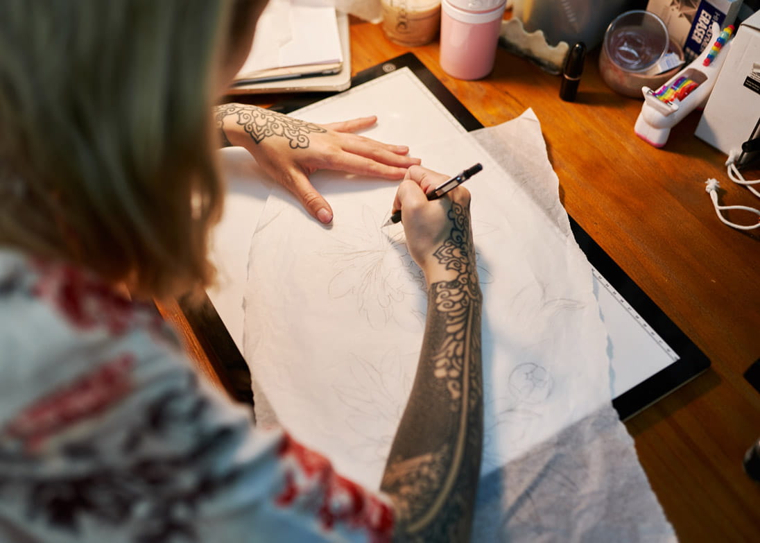 “我是夜间动物,所以我的时间表和大家很不同!我一般十一、二点醒来,喝一杯咖啡就乘地铁到Friday’s Tattoo上班。我喜欢在预约前至少一小时抵达工作室,这样才不会太赶急,确保有足够时间做准备。如果有空闲,我会画一些纹身图,或者做一会研究。虽然我不是来自日本家庭,我对当地的文化和绘画技巧情有独钟,因此主攻日式纹身。一开始,我很难找到客人,因为香港人普遍觉得日式纹身只适合黑社会或极道黑帮,但事实上日本纹身文化背后蕴藏丰富的历史,而且设计都有正面含意。”
