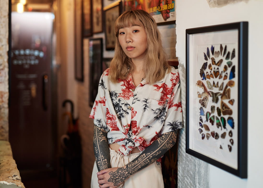 Jenna Chu的作品洋溢丰富的个人风格,她以独特角度诠释日本传统纹身,因此加入行内短短几年就已经广受欢迎。她的创意天赋或许是与生俱来,可是她寻找属于自己的道路,过程相当兜转曲折。“我试过摄影、珠宝设计甚至钻石评级,最后在大学修读室内设计。那时我觉得很苦闷,一点也不享受各种时间表和规范,因为这些全部都是限制。”她忆述说。“我在大学时,男朋友刚好成为了纹身学徒,我就想:在皮肤上画图,听起来蛮有趣!所以我去学习有关的事物,然后就爱上了纹身。我终于感觉自由,可以画我想画的东西,同时了解更多历史,从中采纳灵感并变成新的构思。”