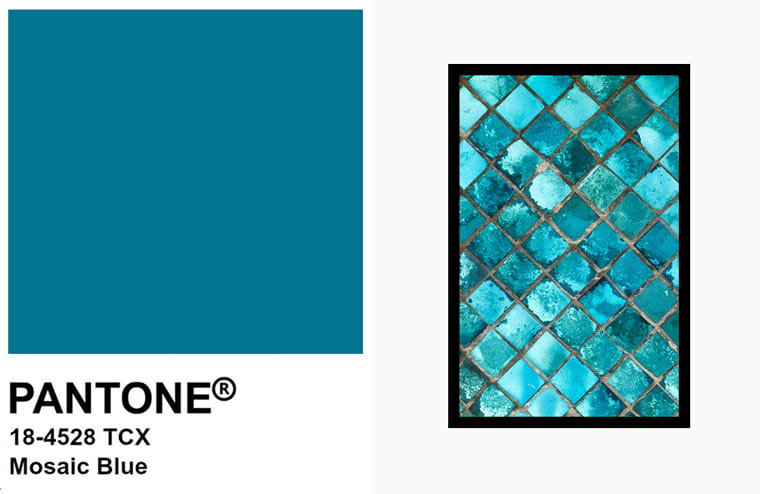彩通色彩研究所指出:「藍綠色系的馬賽克藍展現出神秘、優雅、深奧的感覺。」